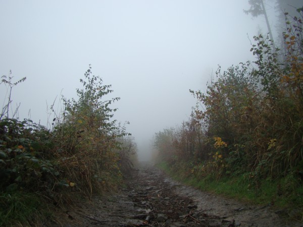 После обеда, в час дня, всё же решил пойти в горы. Цель - нагуляться до последних сил. Дождик временно прекратился и я начал подъем. Туман сильный, по этому все фотографии будут мутные.