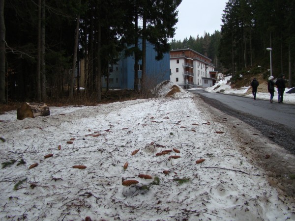 Пошли по указателю. Это шишки на снегу.