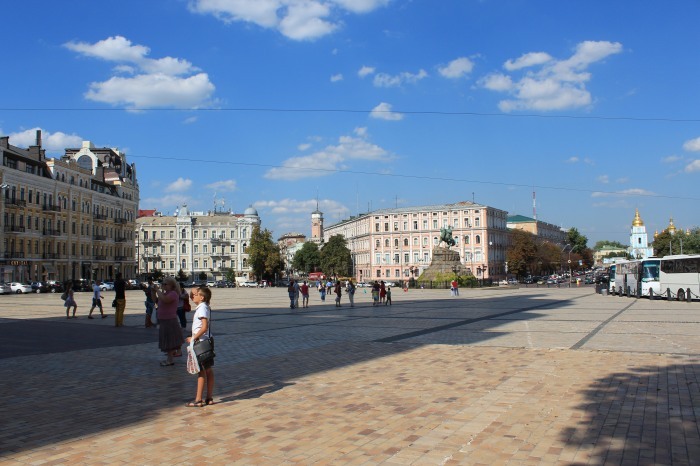Богдан Хмельницкий - еще один герой Украины - восседает на коне в центре Софийской площади. А дальше по прямой еще один соборный комплекс - Михайловский.