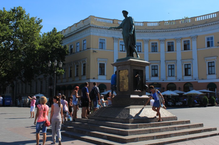 Пройдя по бульвару, мы вышли к памятнику герцогу де Ришельё – это первый памятник, установленный в городе Одесса (1828 г). В 1803 году Ришельё стал градоначальником, а с 1805 по 1814 г. генерал-губернатором Одессы. Одесситы называли его «наш Дюк» и считали основателем города, хотя к тому времени Одессе было уже 8 лет. Стараниями нового градоначальника город превратился в крупный торговый порт. Когда Бурбоны вернули себе трон, Дюк уехал во Францию, где стал премьер-министром в правительстве Людовика XVIII.
